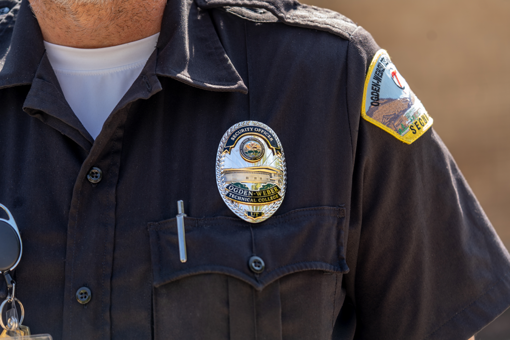 Smiling campus security officer in uniform with badge and sunglasses outdoors on campus